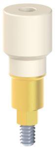 Protetické komponenty na zubní implantáty - můstkové Ti-baze CAD CAM bez indexace a tvarem dosedu nového typu tzv. 3D s prefabrikovanou vertikální výškou korunkové části Interface(u) 3.5 mm . Korunkovou část báze je možné pomocí zvláštního IPD nástroje- vodícího prstence okluzálně snížit a nebo upravit angulaci transokluzálního fixačního kanálu proříznutím vstupu pro systémový šroubovák. K takto upravené můstkové CAD CAM bázi pak nabízíme k dispozici softvérové knihovny pro programy exocad Dental CAD Software a 3Shape Dental System® , kde ke každé jednotlivé slizniční výšce volíme danou softvérovou knihovnu (výšky nabízíme 0.5 mm, 1.5 a 2.5 mm). U této konkrétní Ti-baze je slizniční výška schůdku 1.5 mm . Ti-baze CAD CAM mají prefabrikované mikroretence pro lepší bondování protetické práce ke korunkové části báze a povrch bazí je zpevněný procesem nitridací titanu (TiN) zabraňující opotřeben...